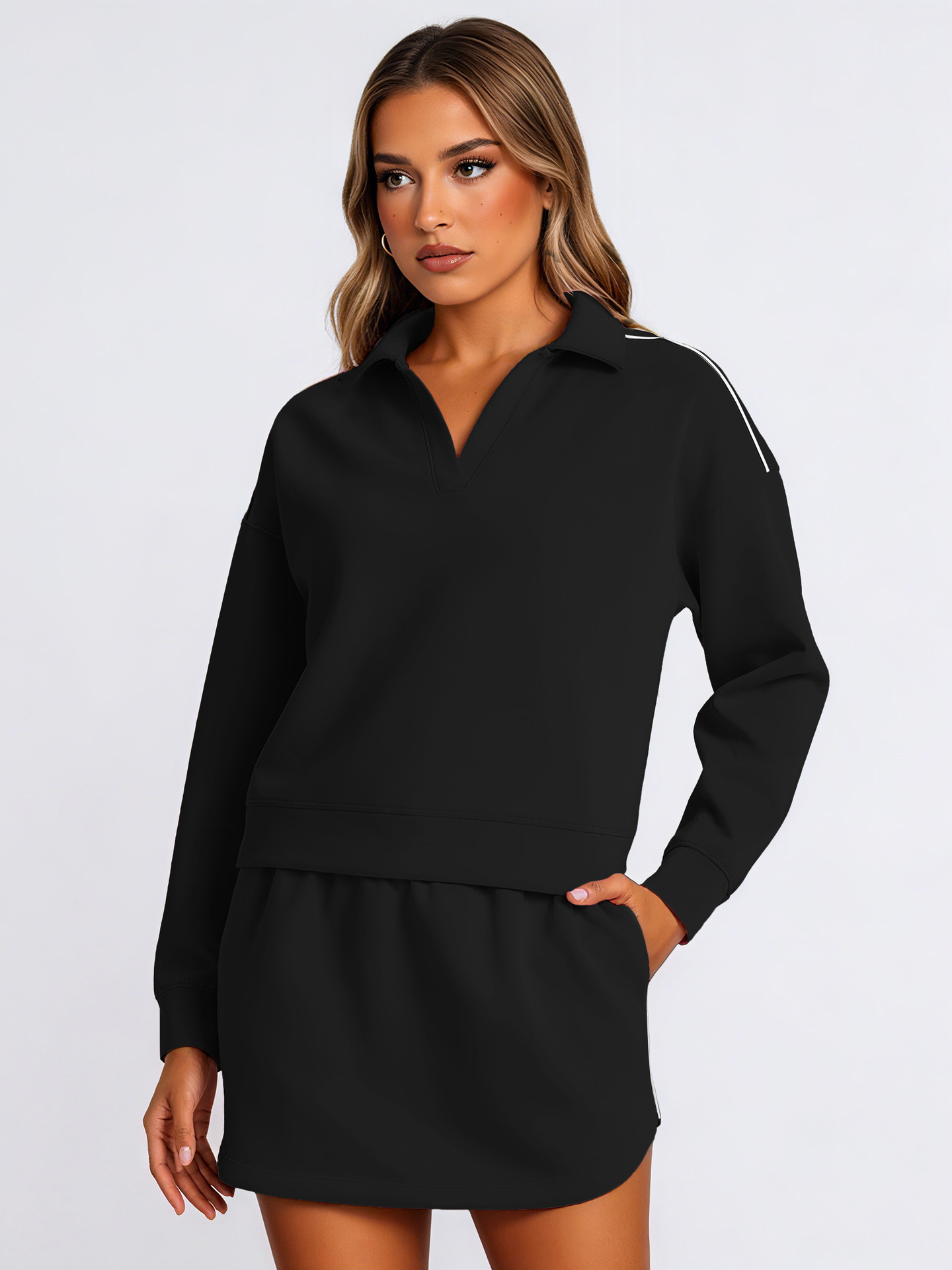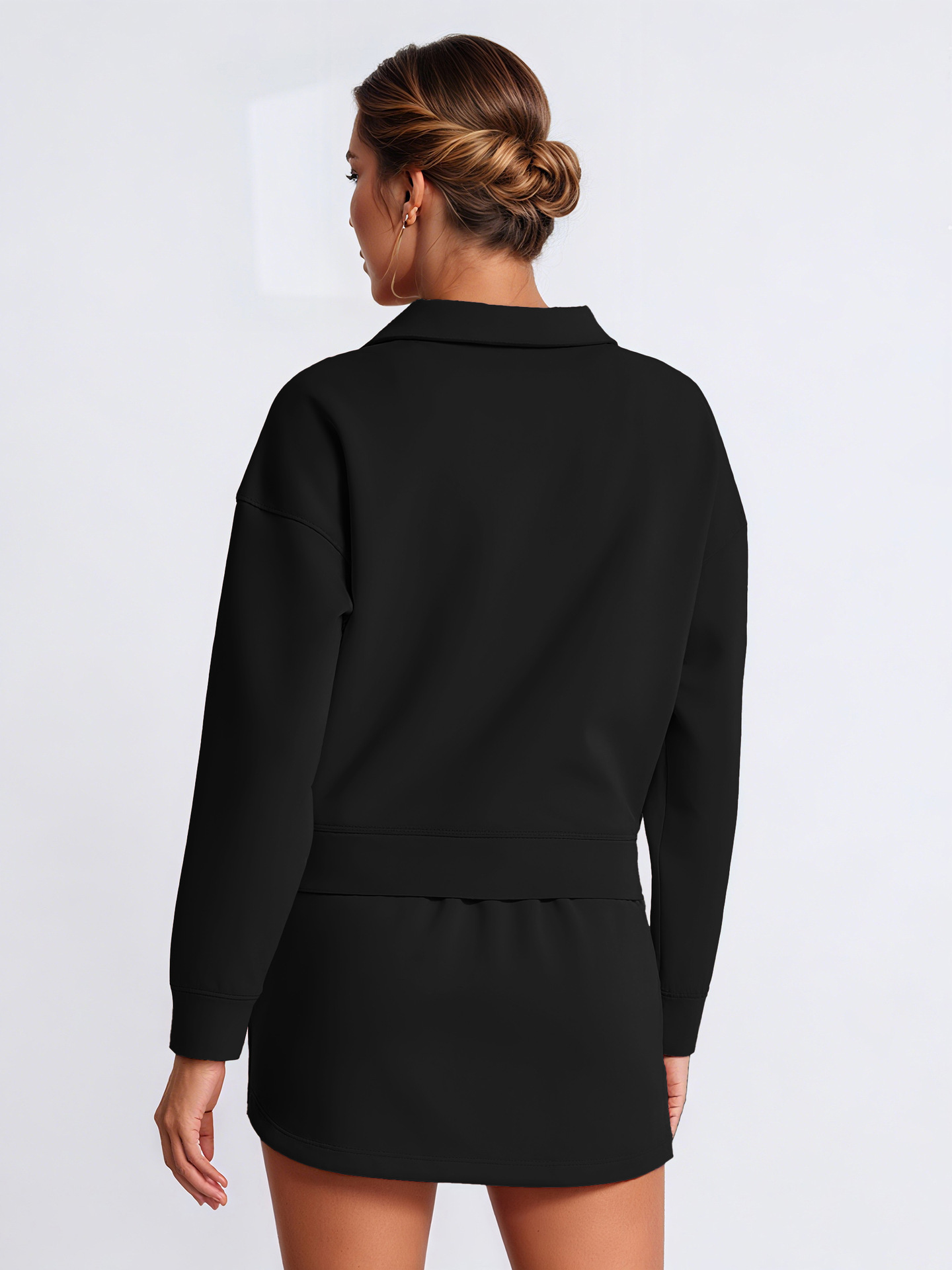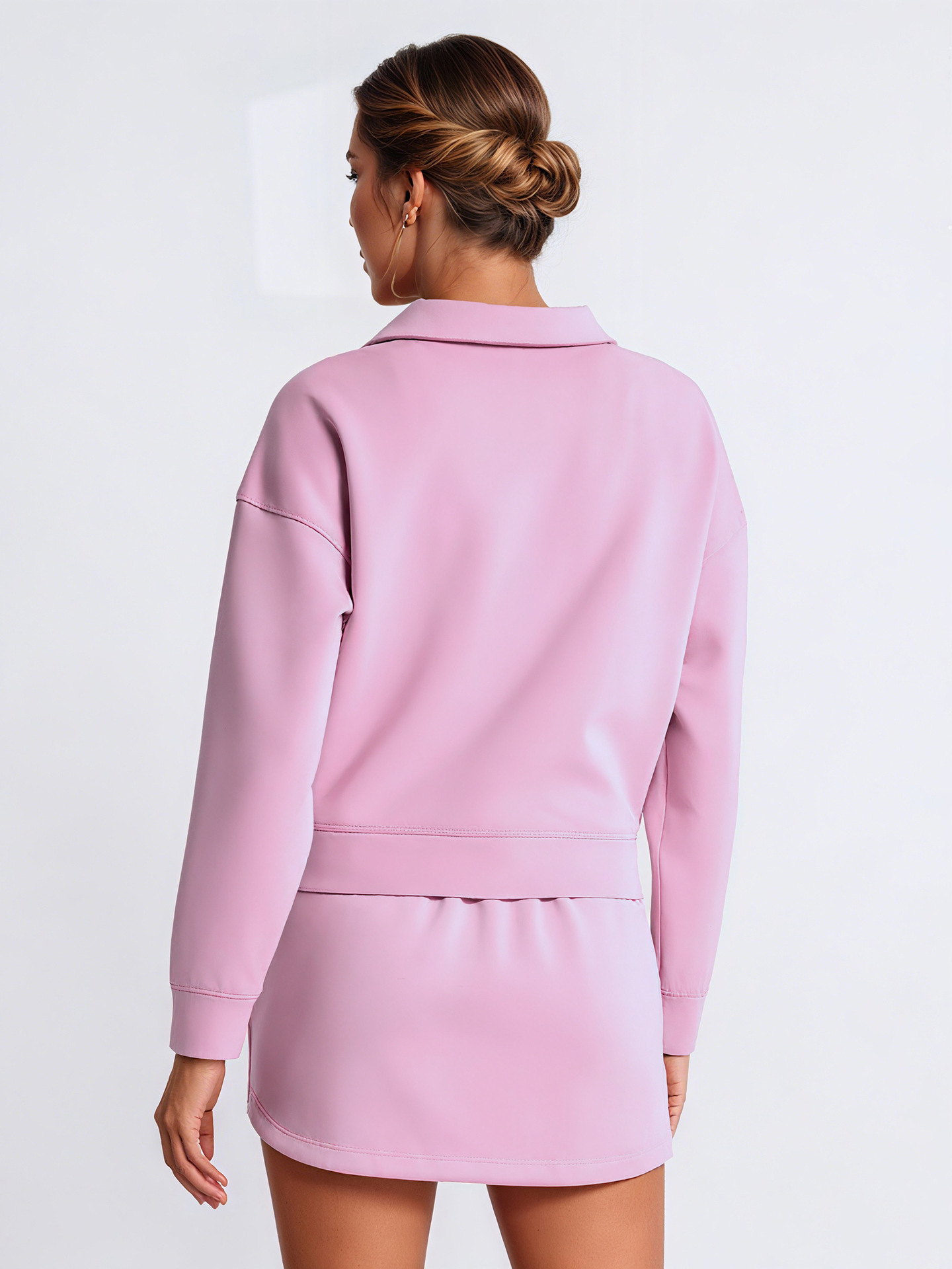 Casual Sport Lapel Long Sleeve Top With Pocket Skirt Set