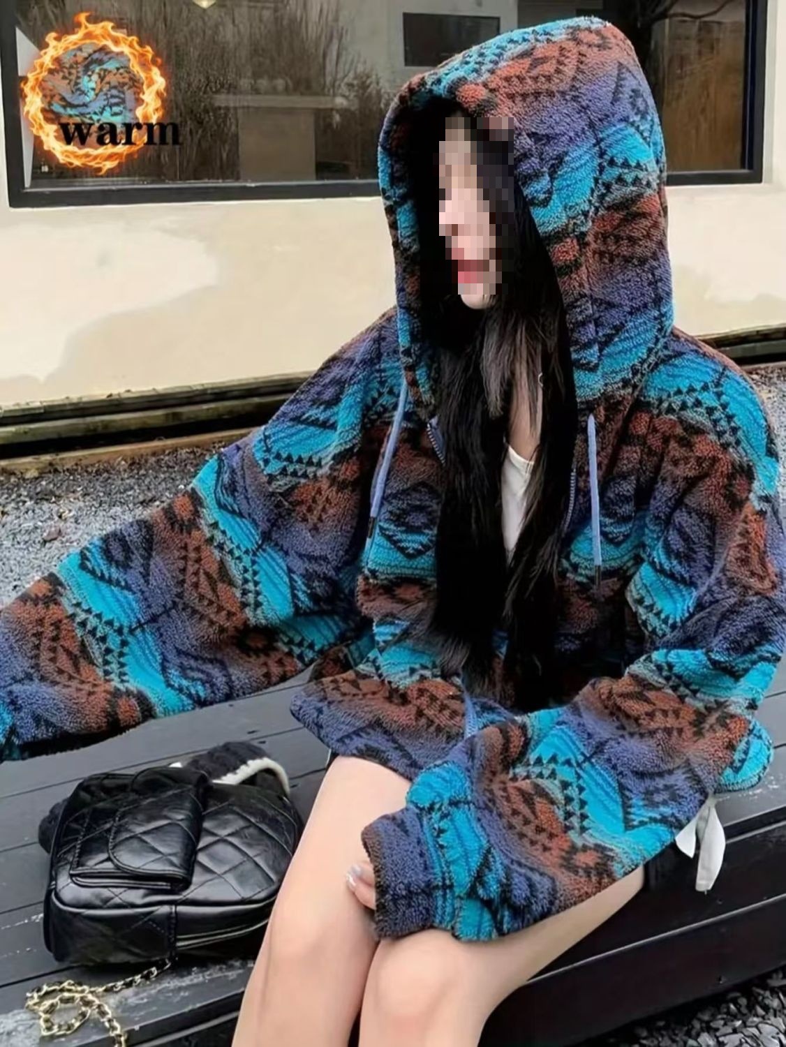 Double-sided Fleece Color-blocking Printed Pattern Jacket Cardigan