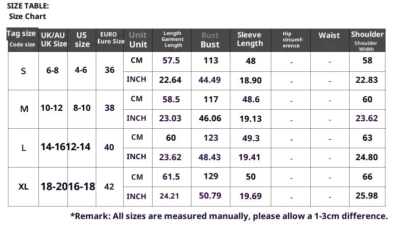 Note: 1. Asian sizes are 1 to 2 sizes smaller than European and American people. Choose the larger size if your size between two sizes. Please allow 2-3cm differences due to manual measurement. 2. Please check the size chart carefully before you buy the item, if you don't know how to choose size, please contact our customer service. 3.As you know, the different computers display colors differently, the color of the actual item may vary slightly from the following images.