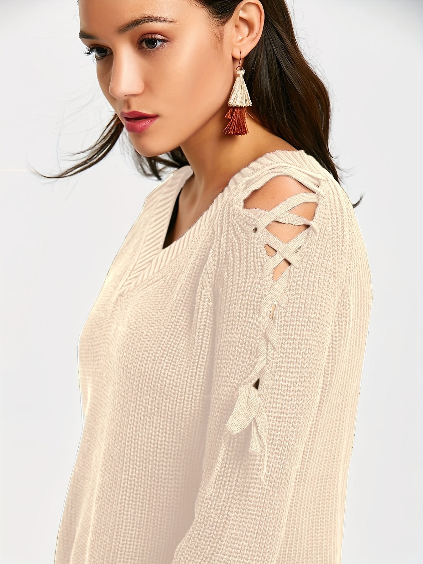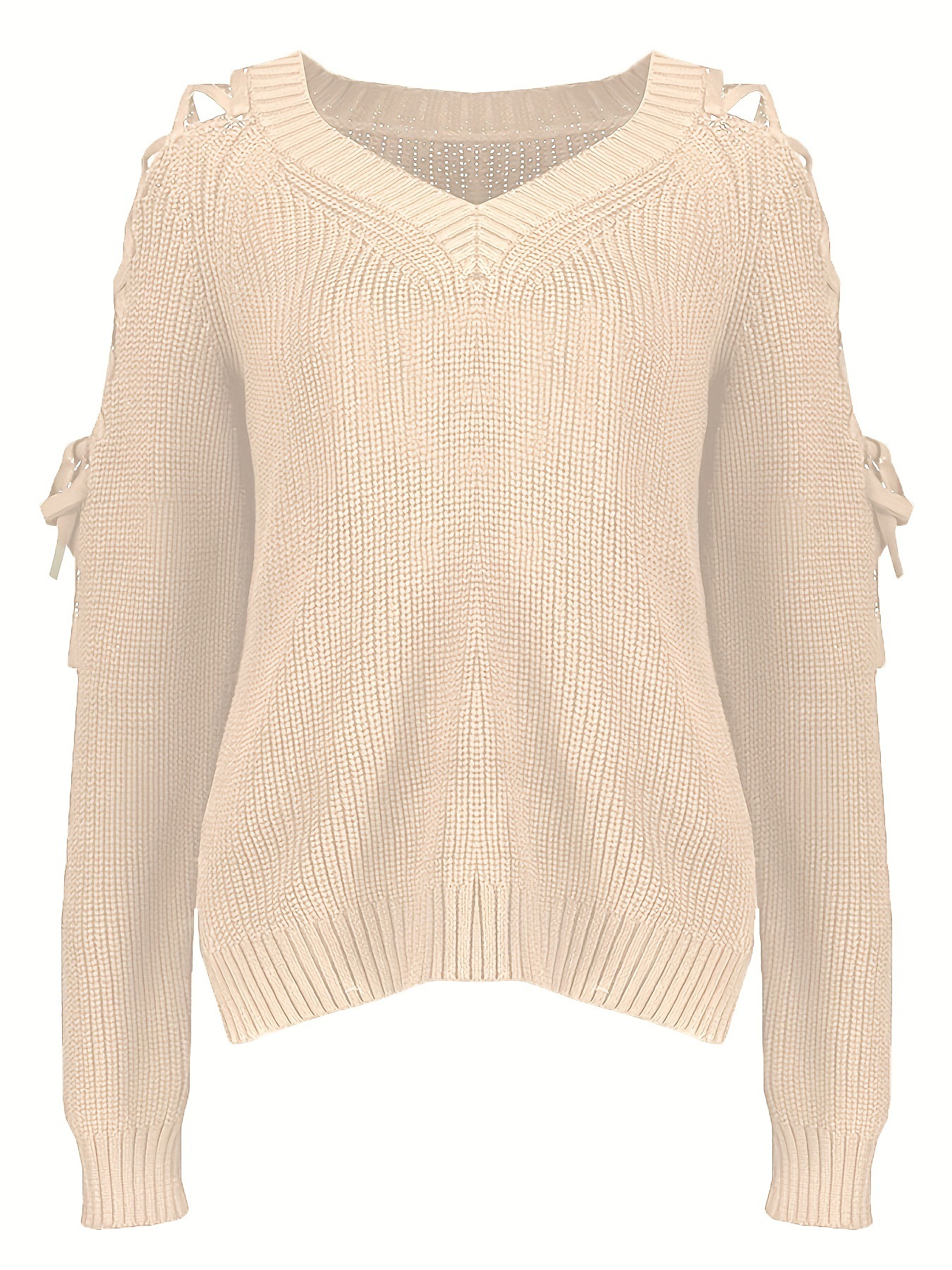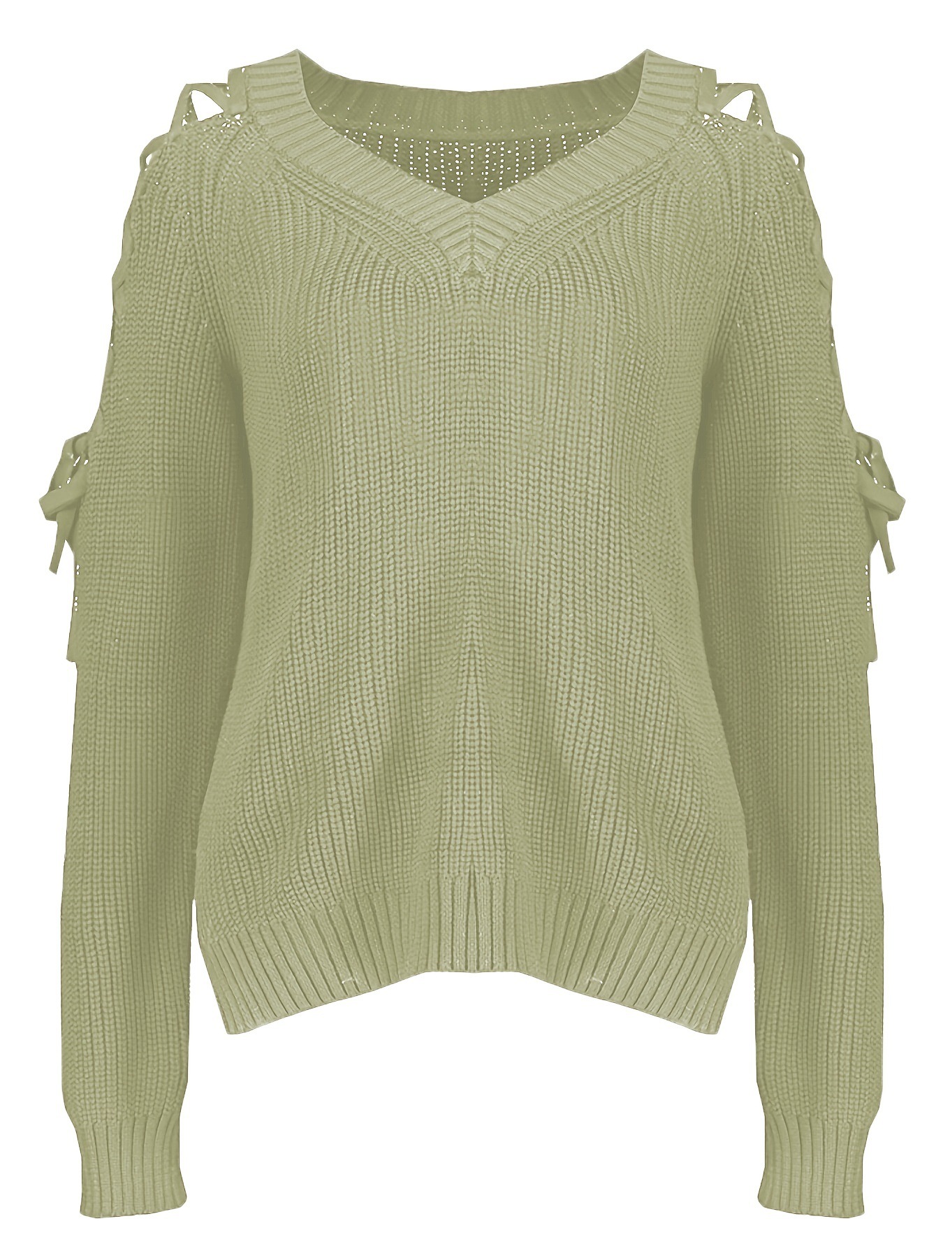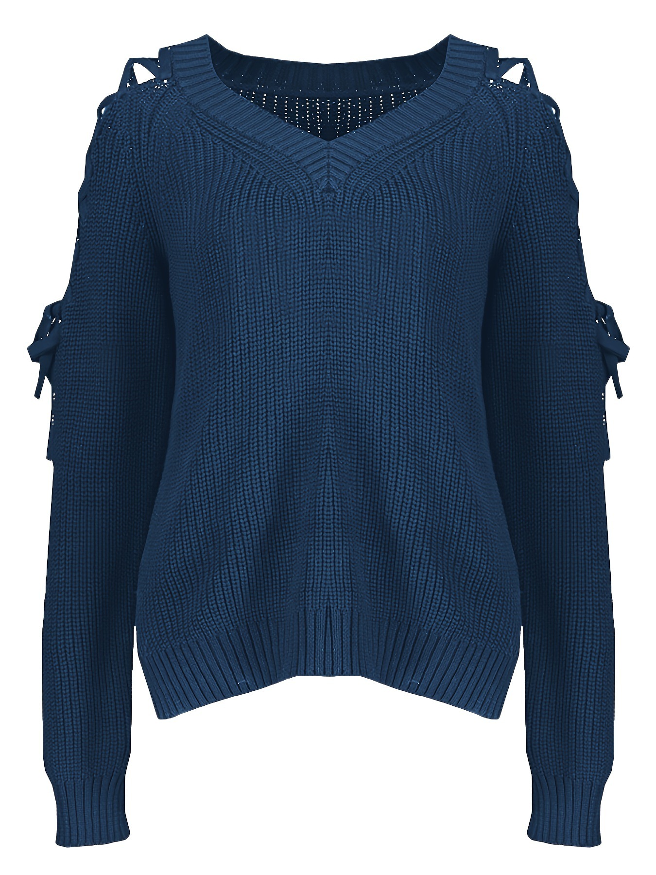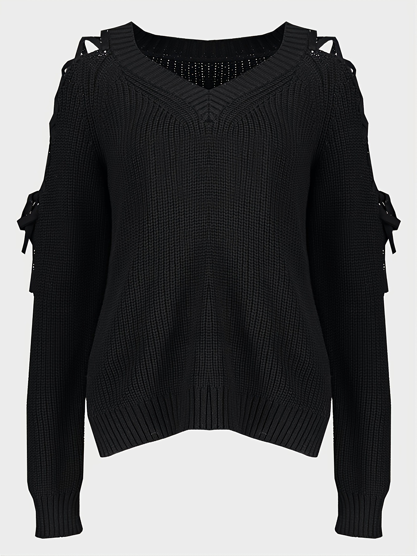 Hollow Knit Sweater Women Long Sleeve Tie Loose V-neck