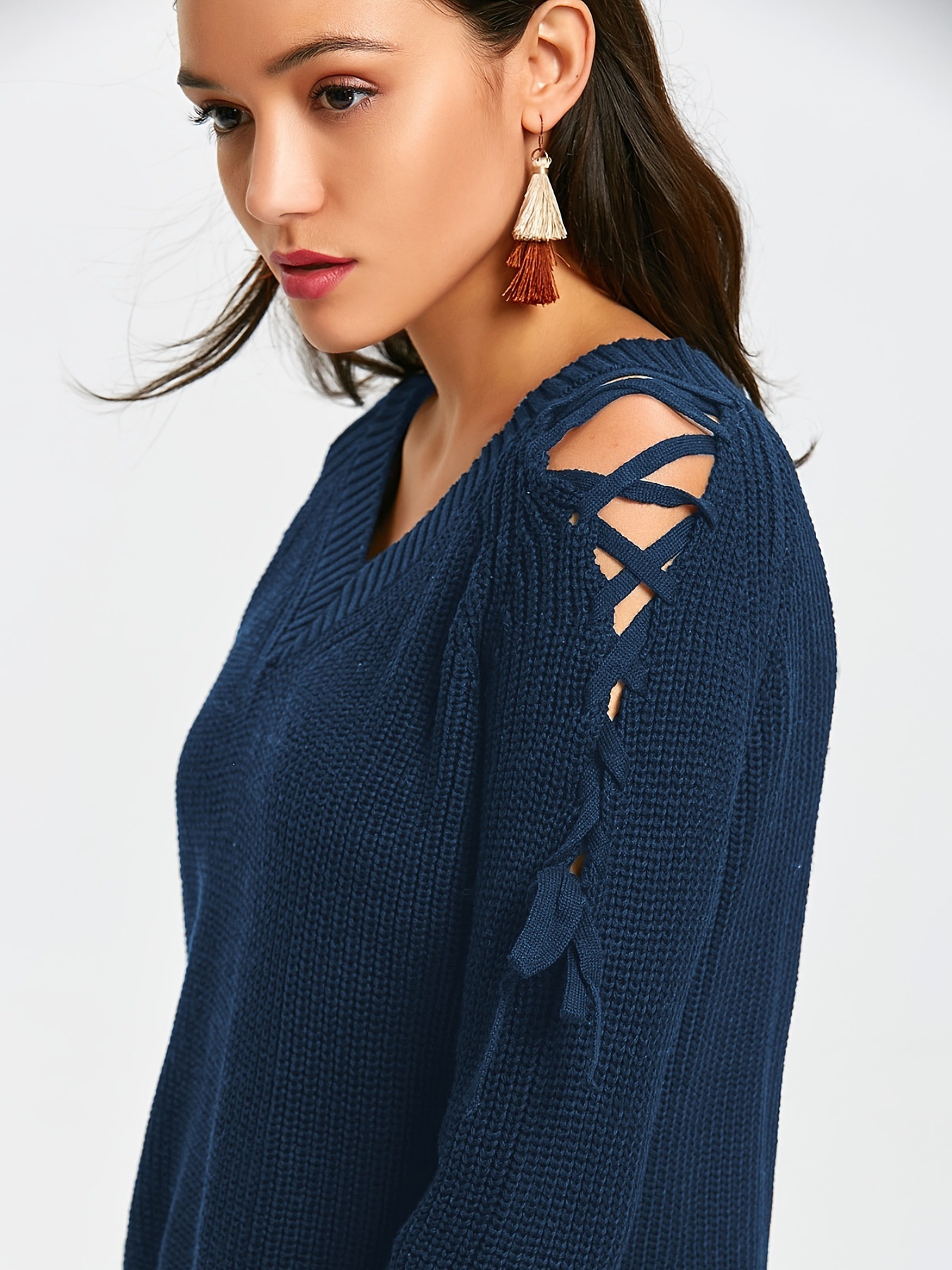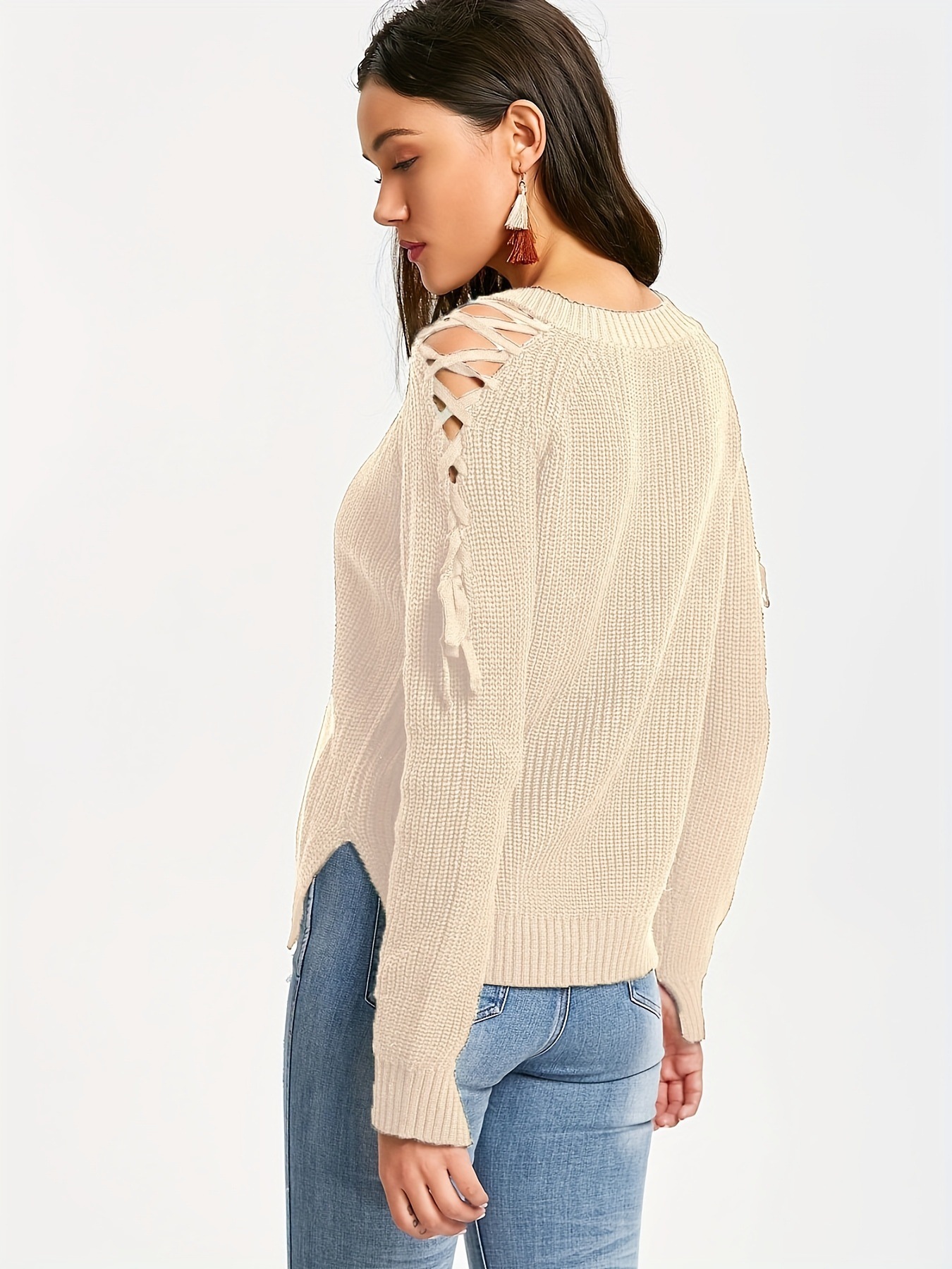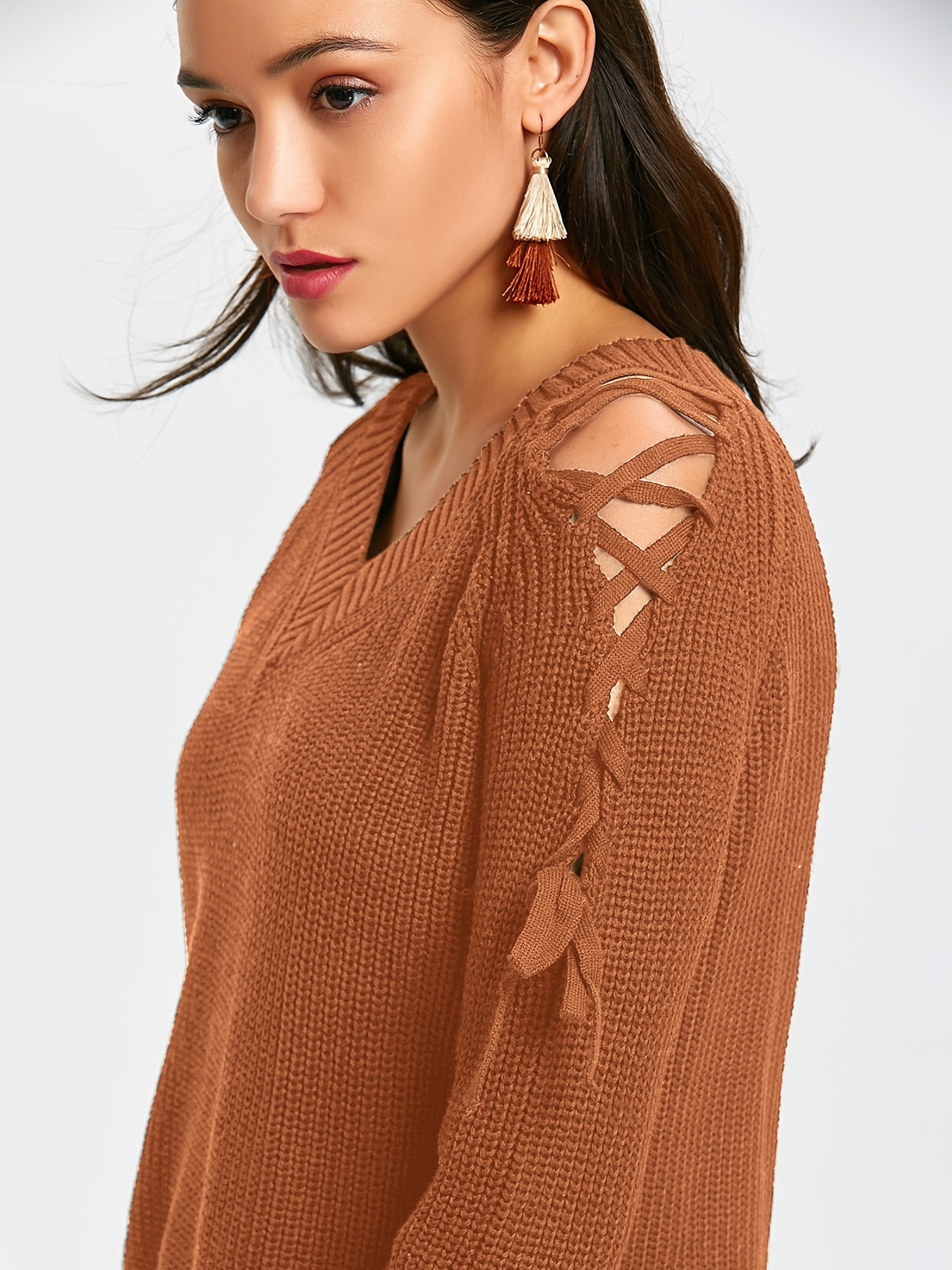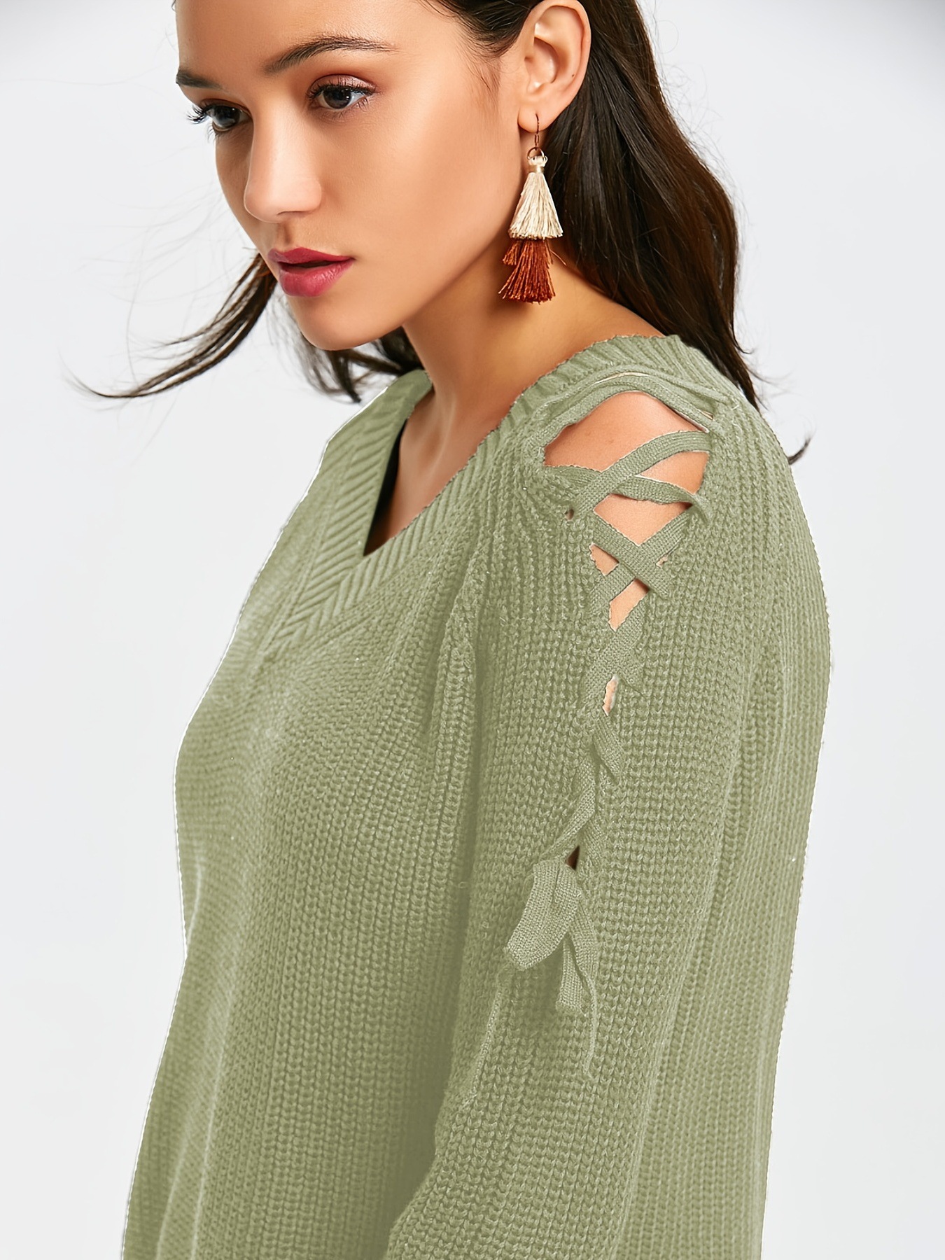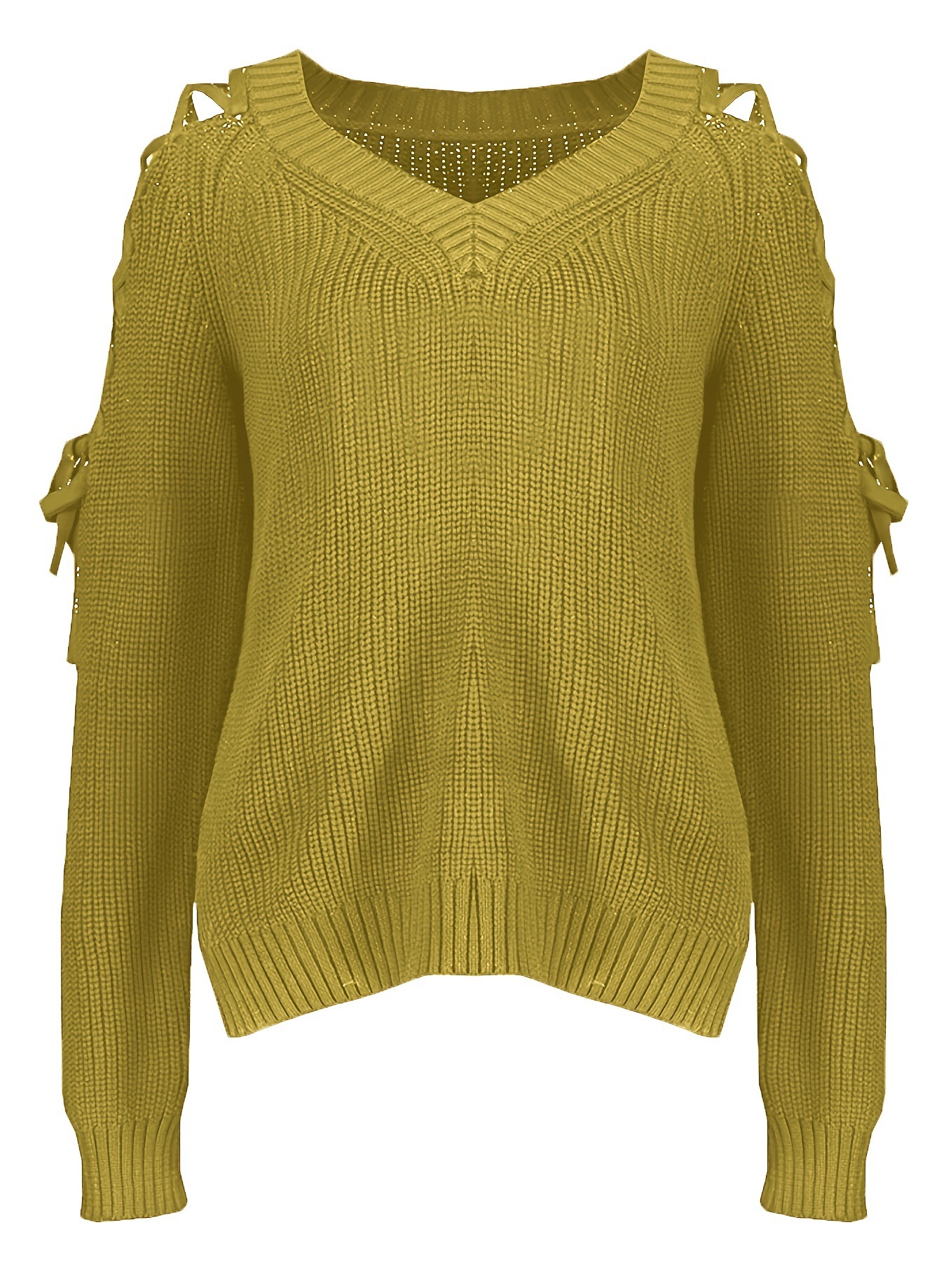 Hollow Knit Sweater Women Long Sleeve Tie Loose V-neck