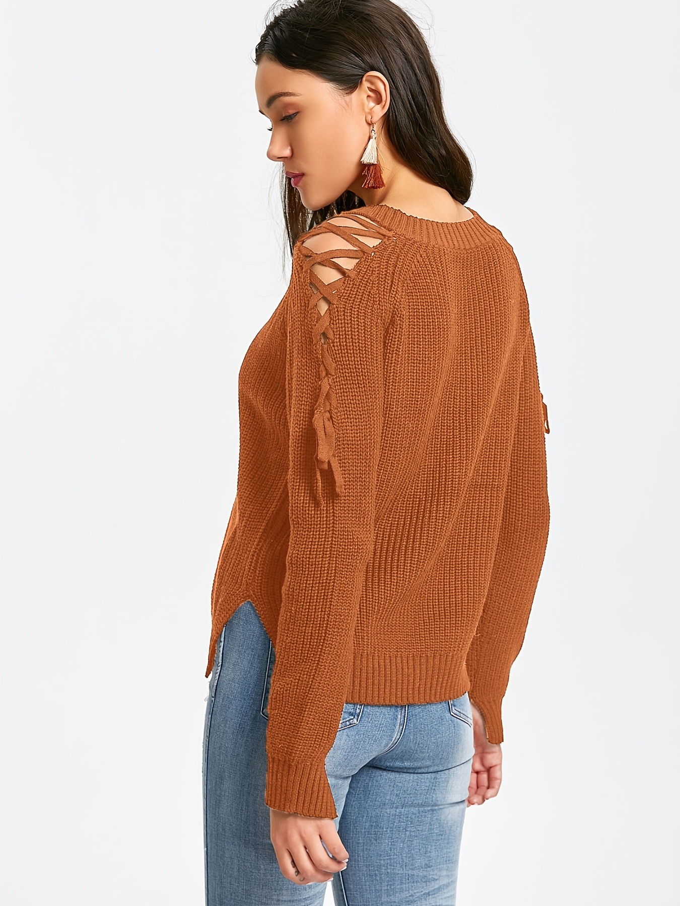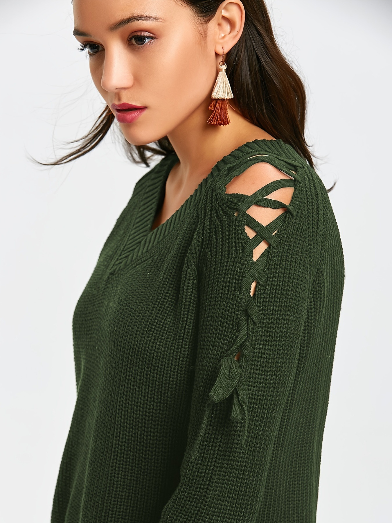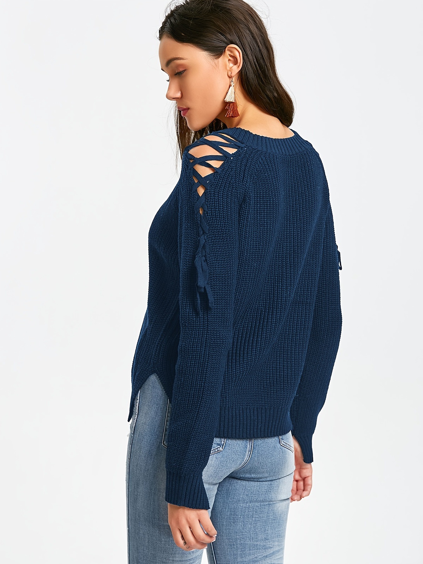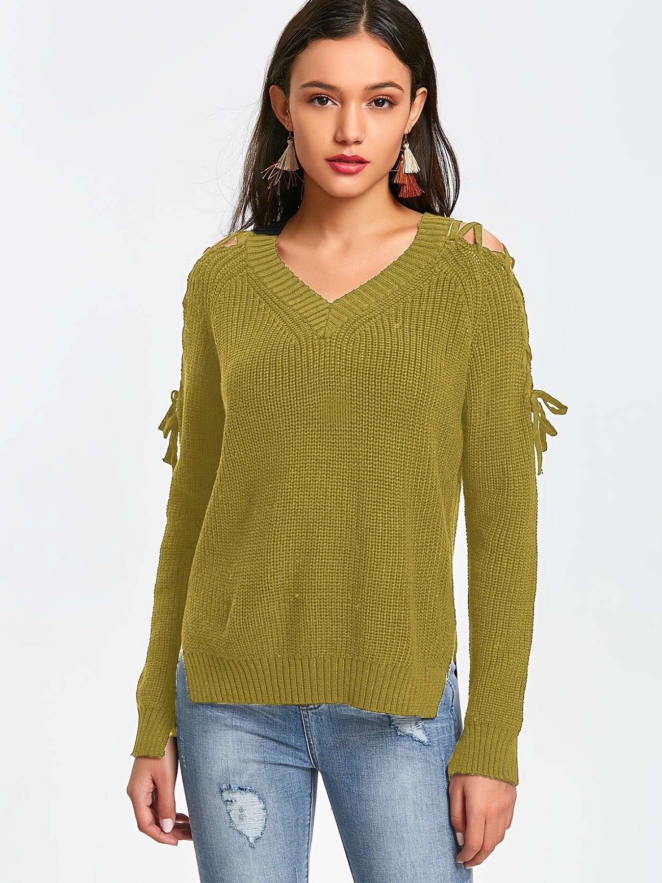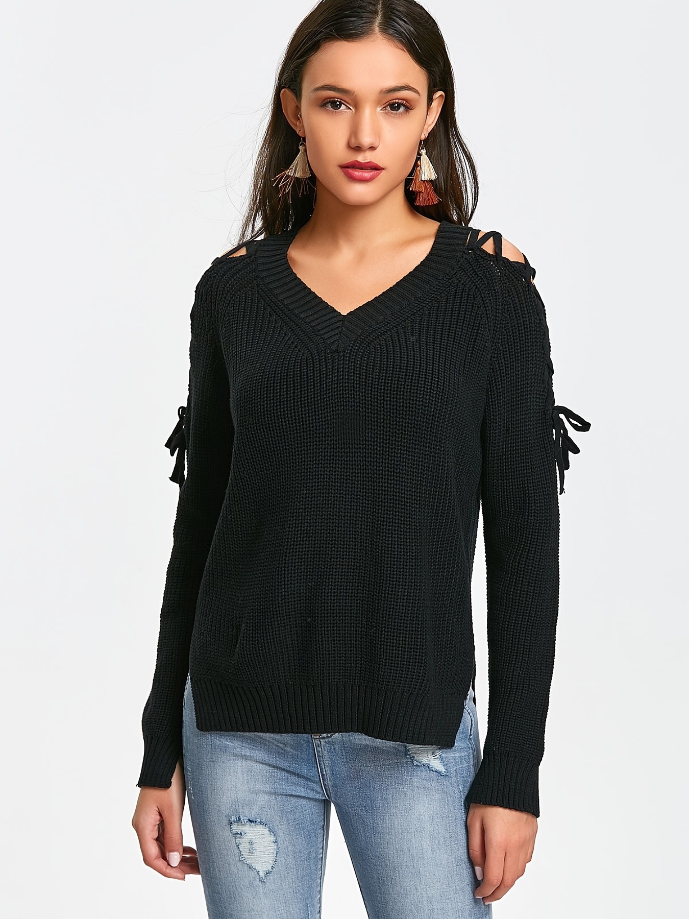 Hollow Knit Sweater Women Long Sleeve Tie Loose V-neck