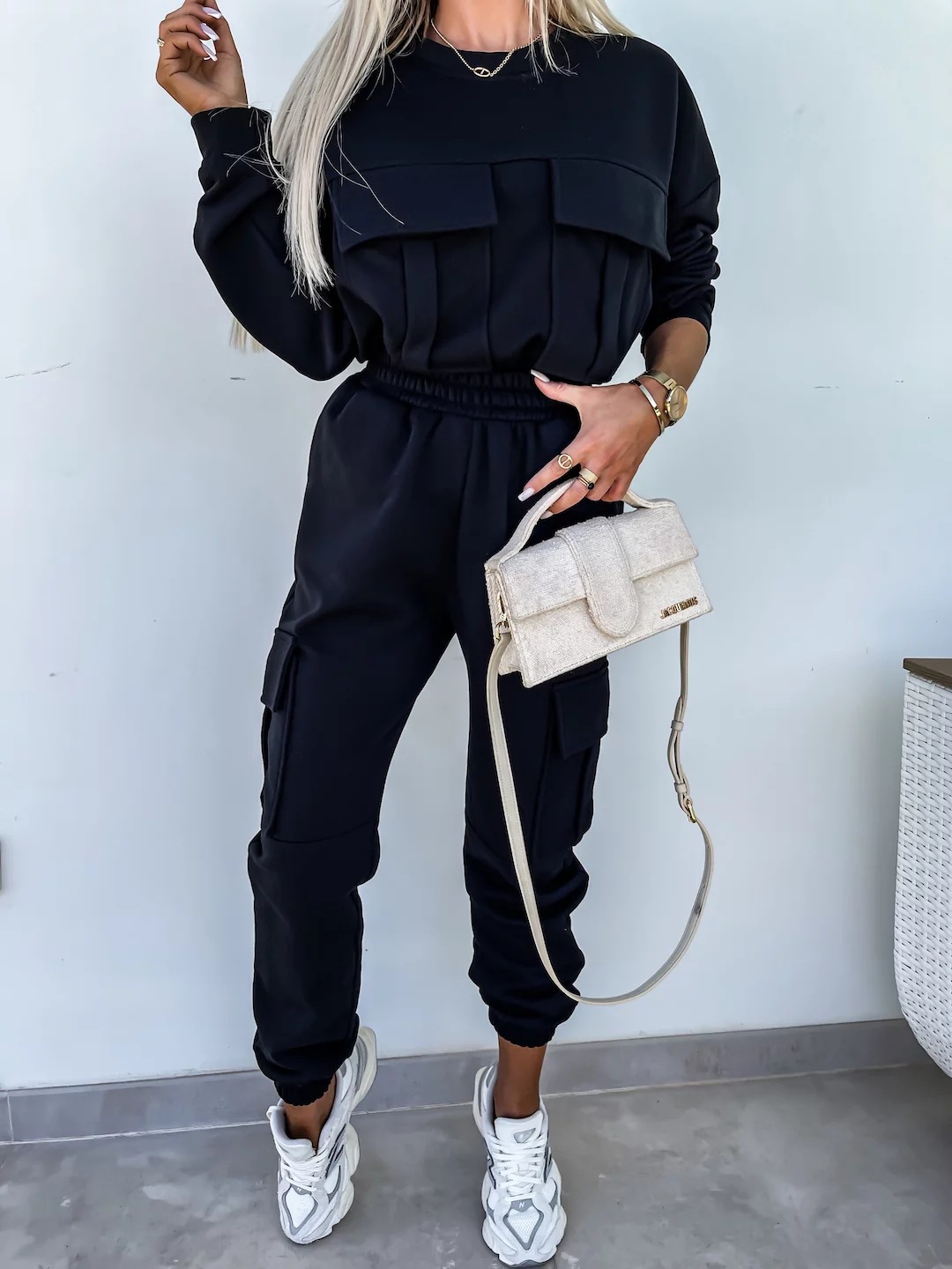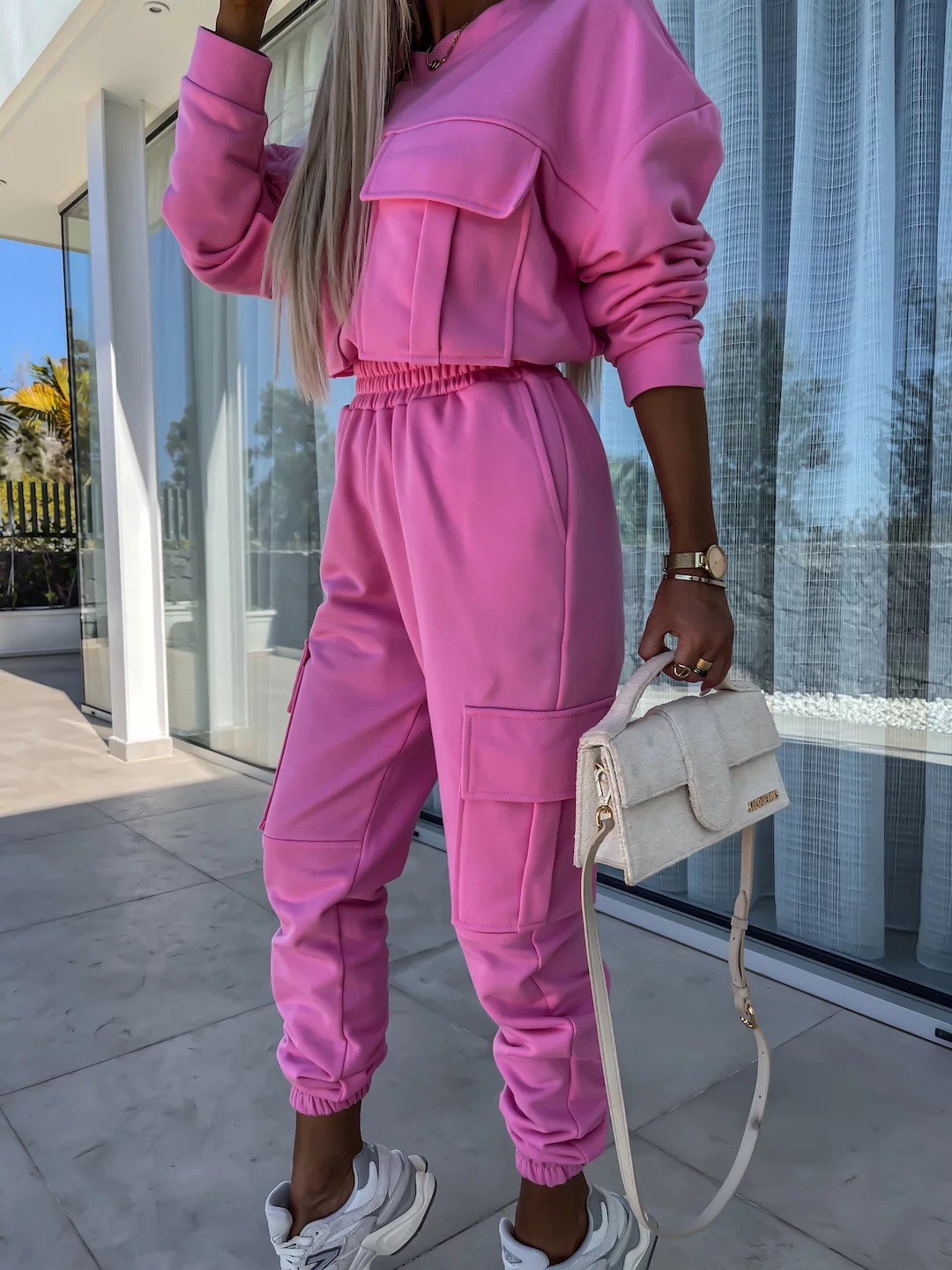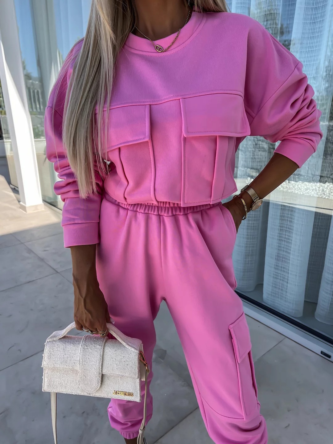 Long Sleeve Round Neck Pocket Loose Sweatshirt Casual Sports Pants
