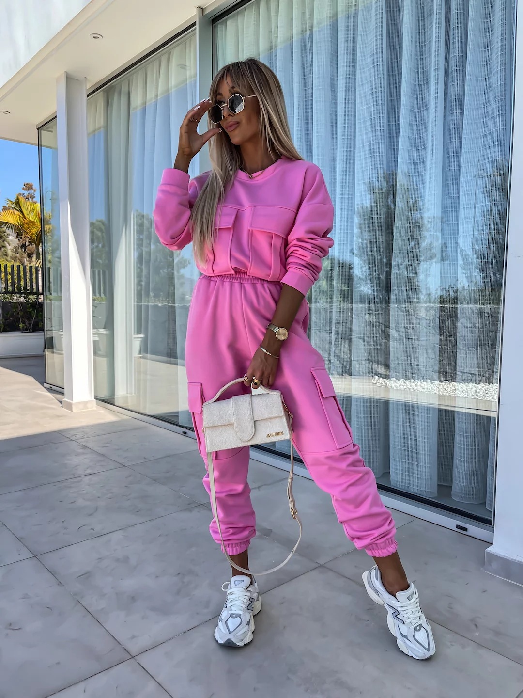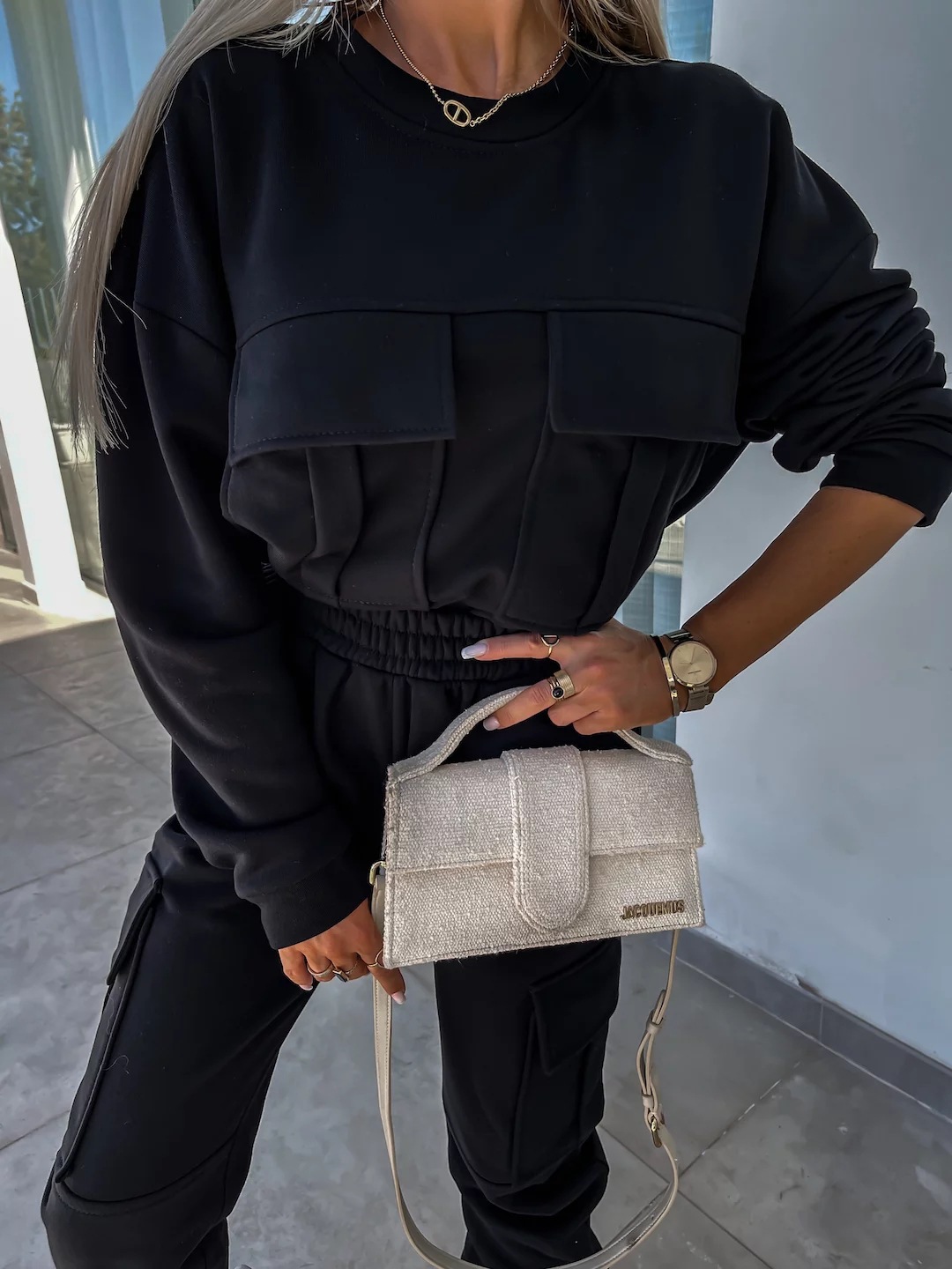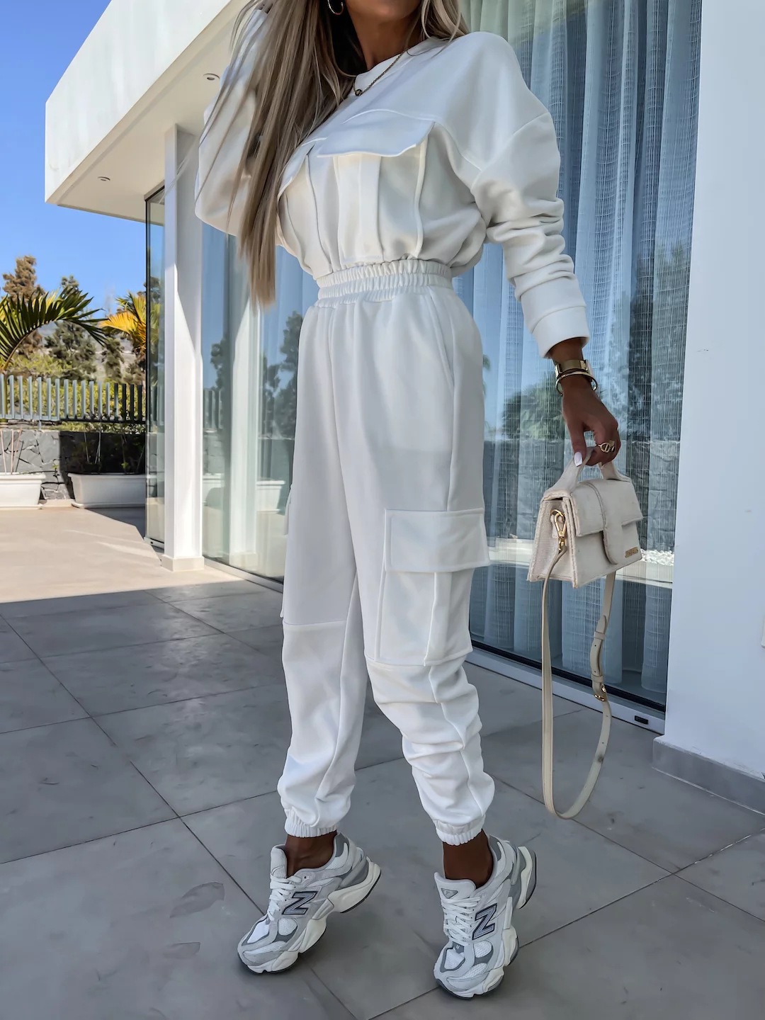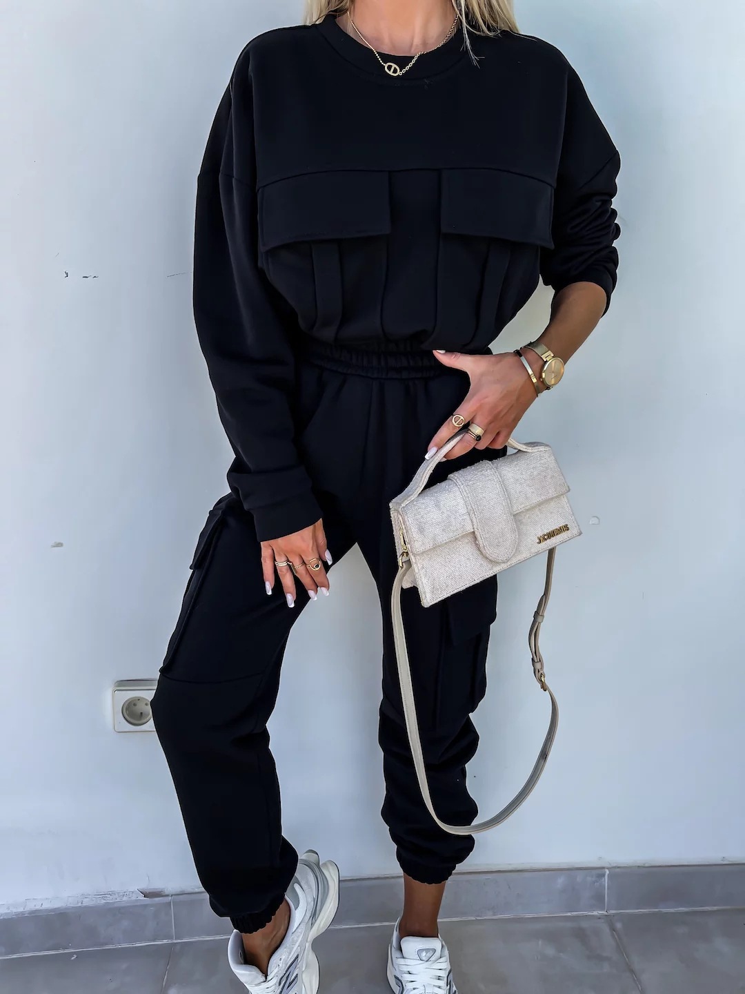 Long Sleeve Round Neck Pocket Loose Sweatshirt Casual Sports Pants