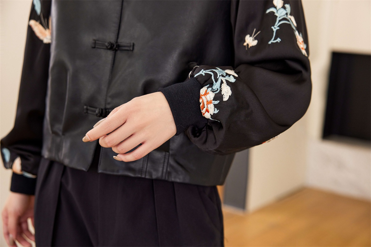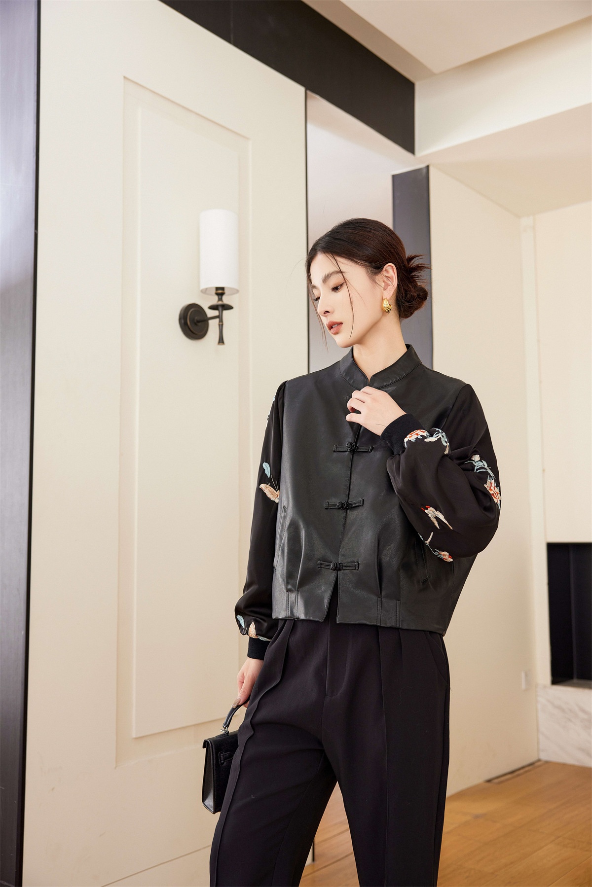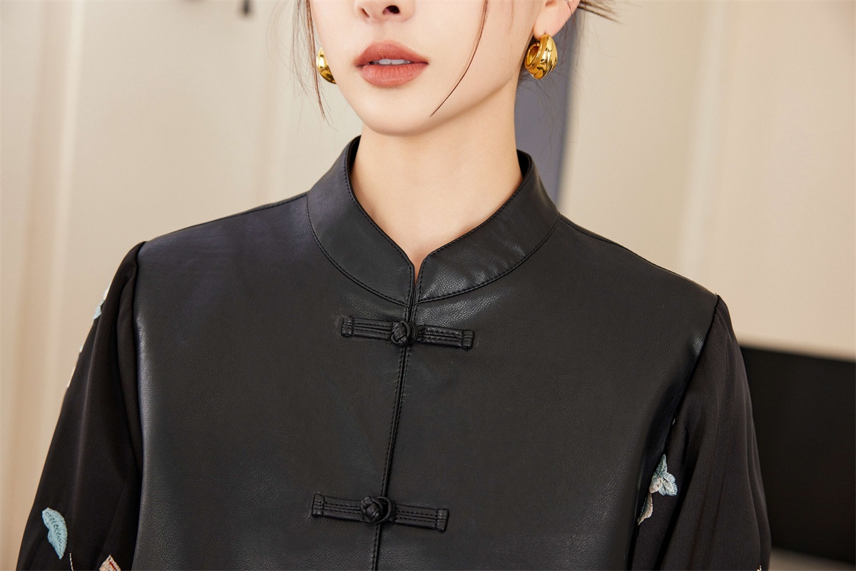 New Chinese Style Stitching Leather Coat Women's Retro Women's