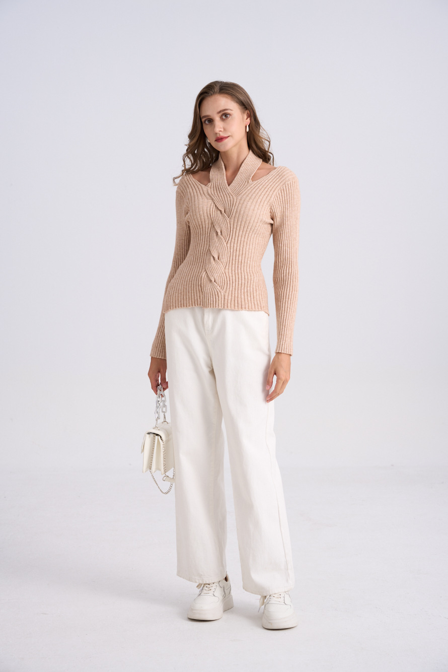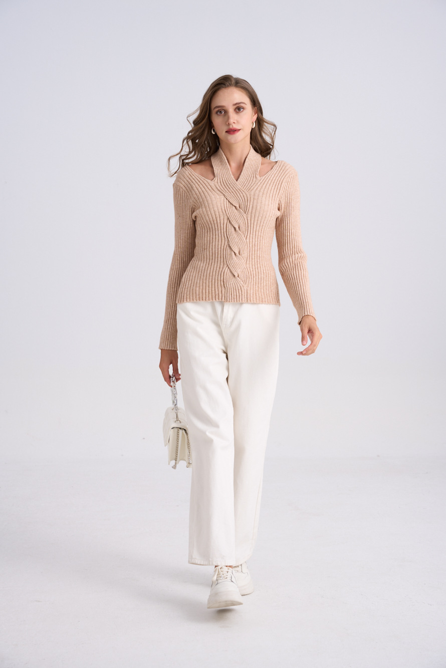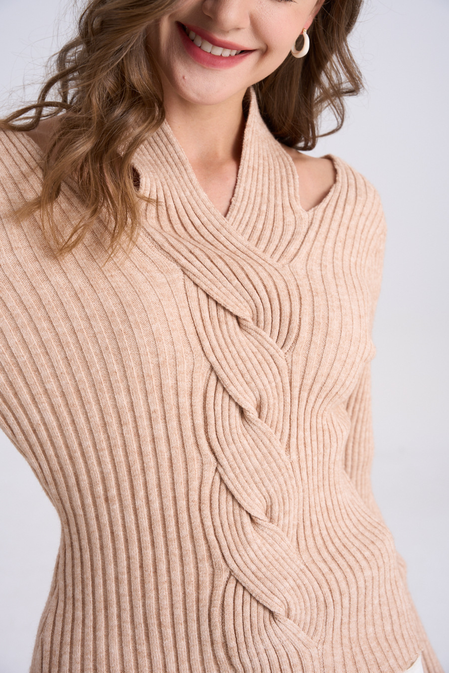 V-neck Cable Knit Sweater Turtleneck Ribbed Long-sleeve Top For Women