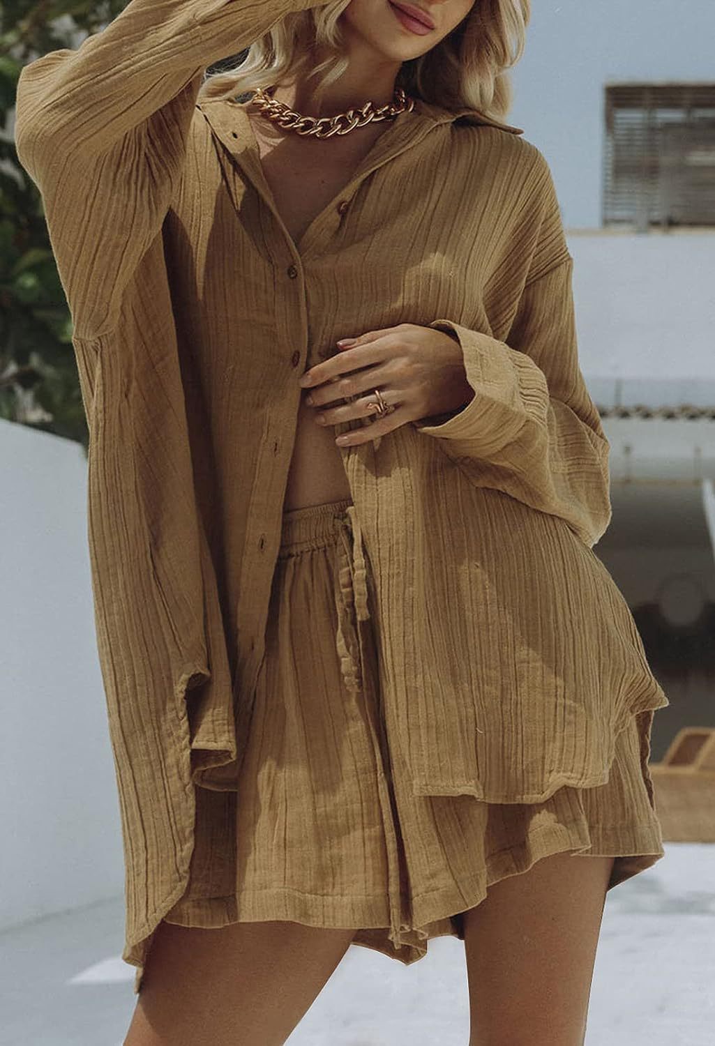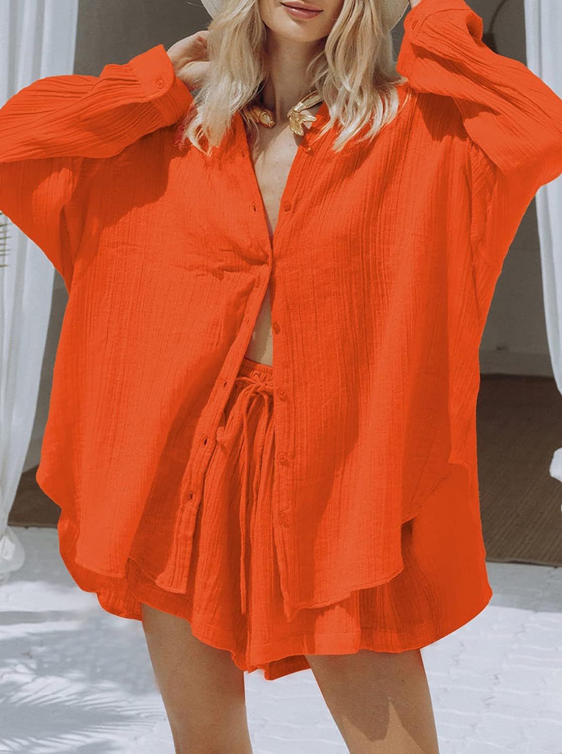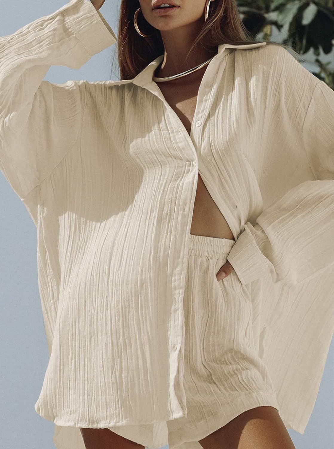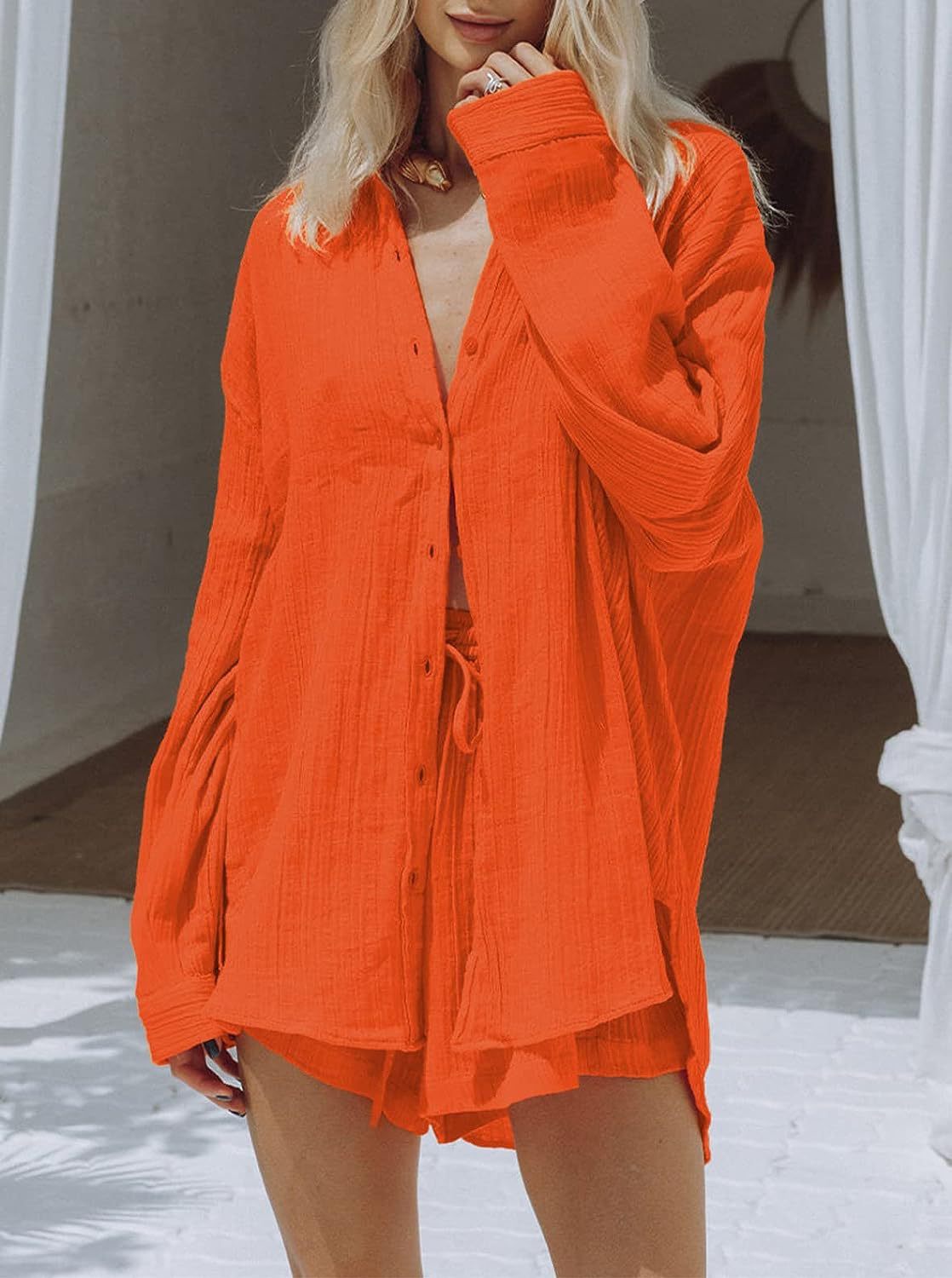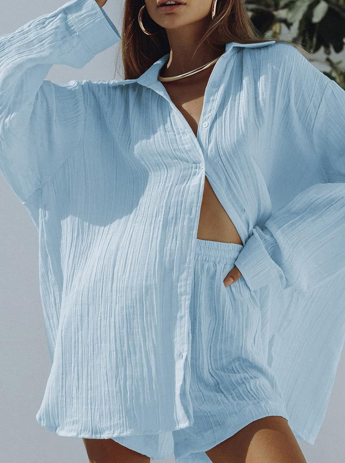 Women's Casual Long-sleeve Shirt And Shorts Set