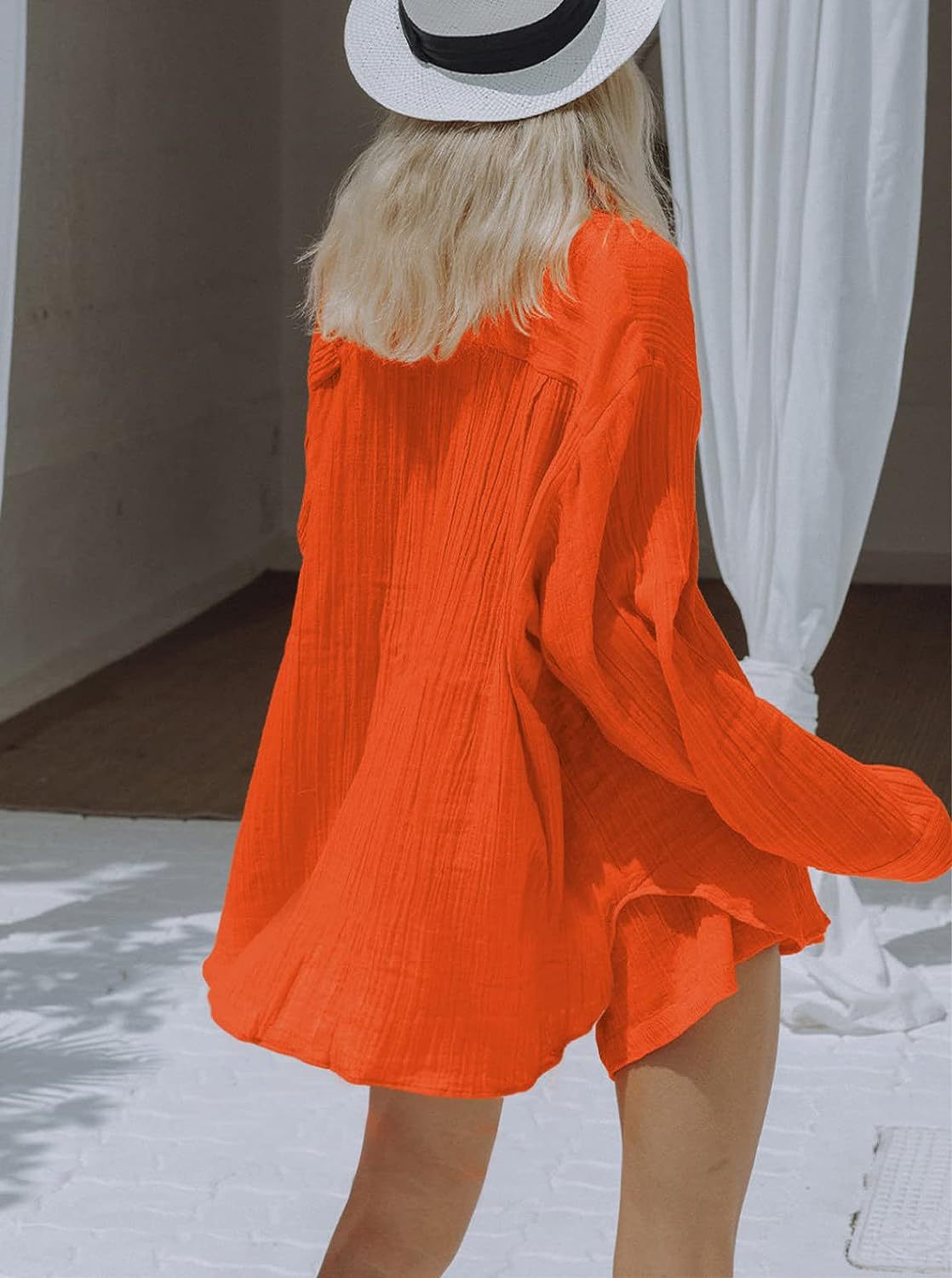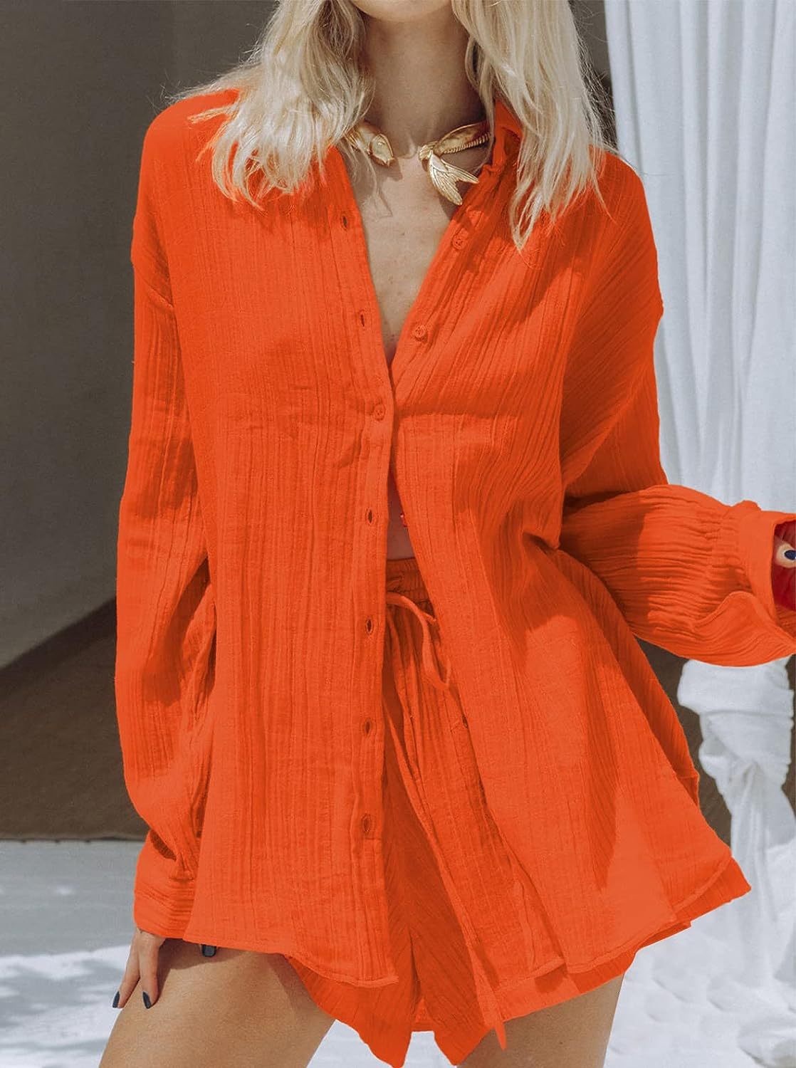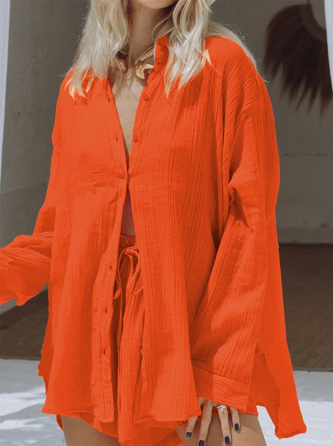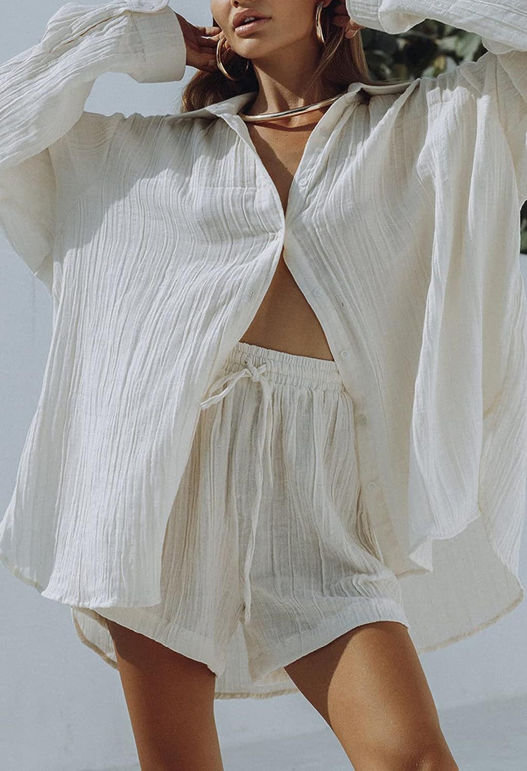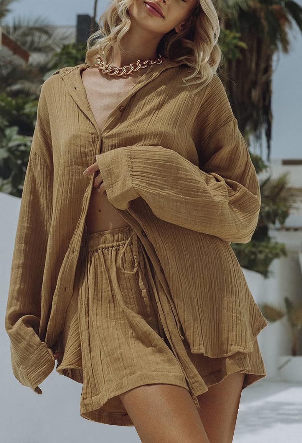 Women's Casual Long-sleeve Shirt And Shorts Set