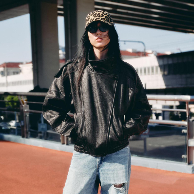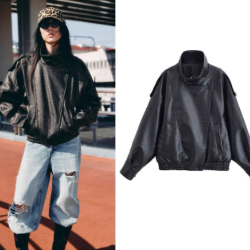 Women's Graceful Stand Collar Wholesale Litchi Leather Jacket